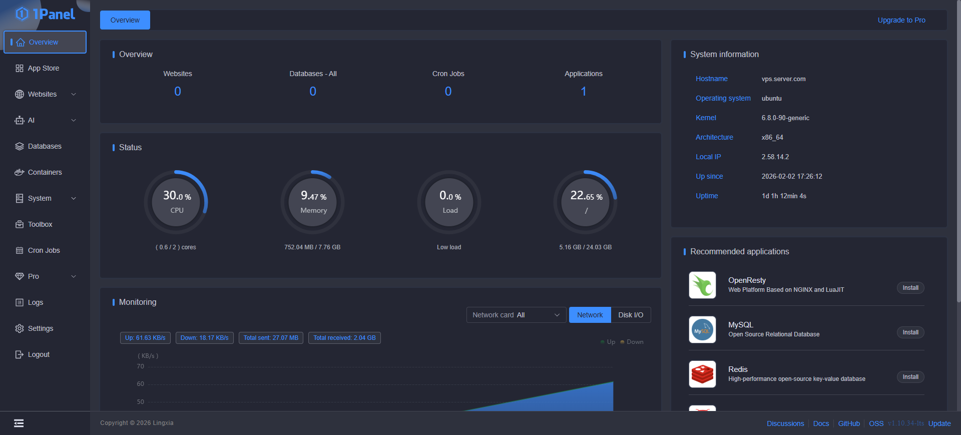 1Panel is an open-source, web-based server management panel for Linux servers. It provides a UI for managing files, containers, websites, databases, system monitoring, and scheduled tasks.