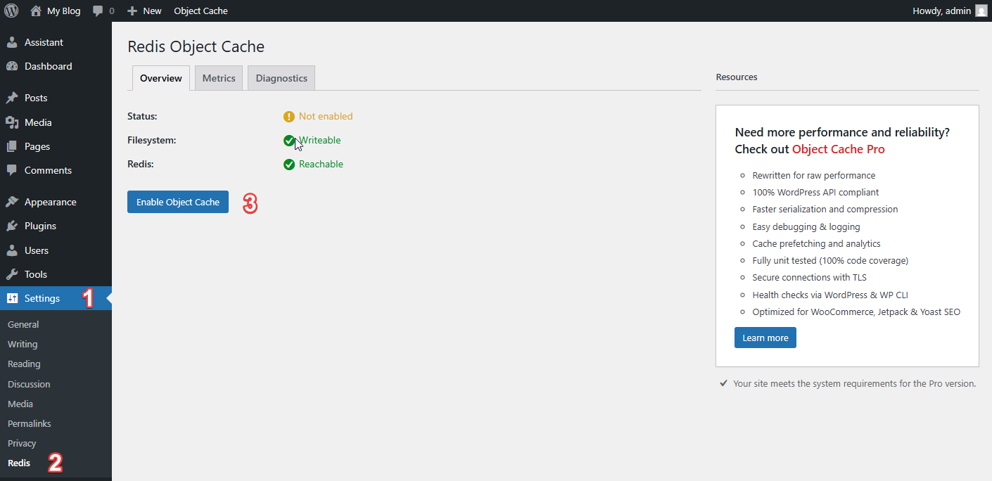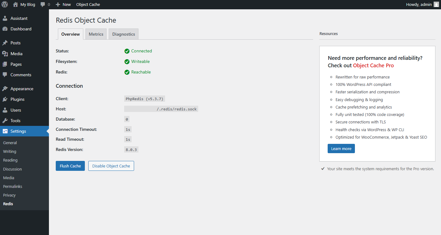 - Go to Settings > Redis from your WordPress menu.