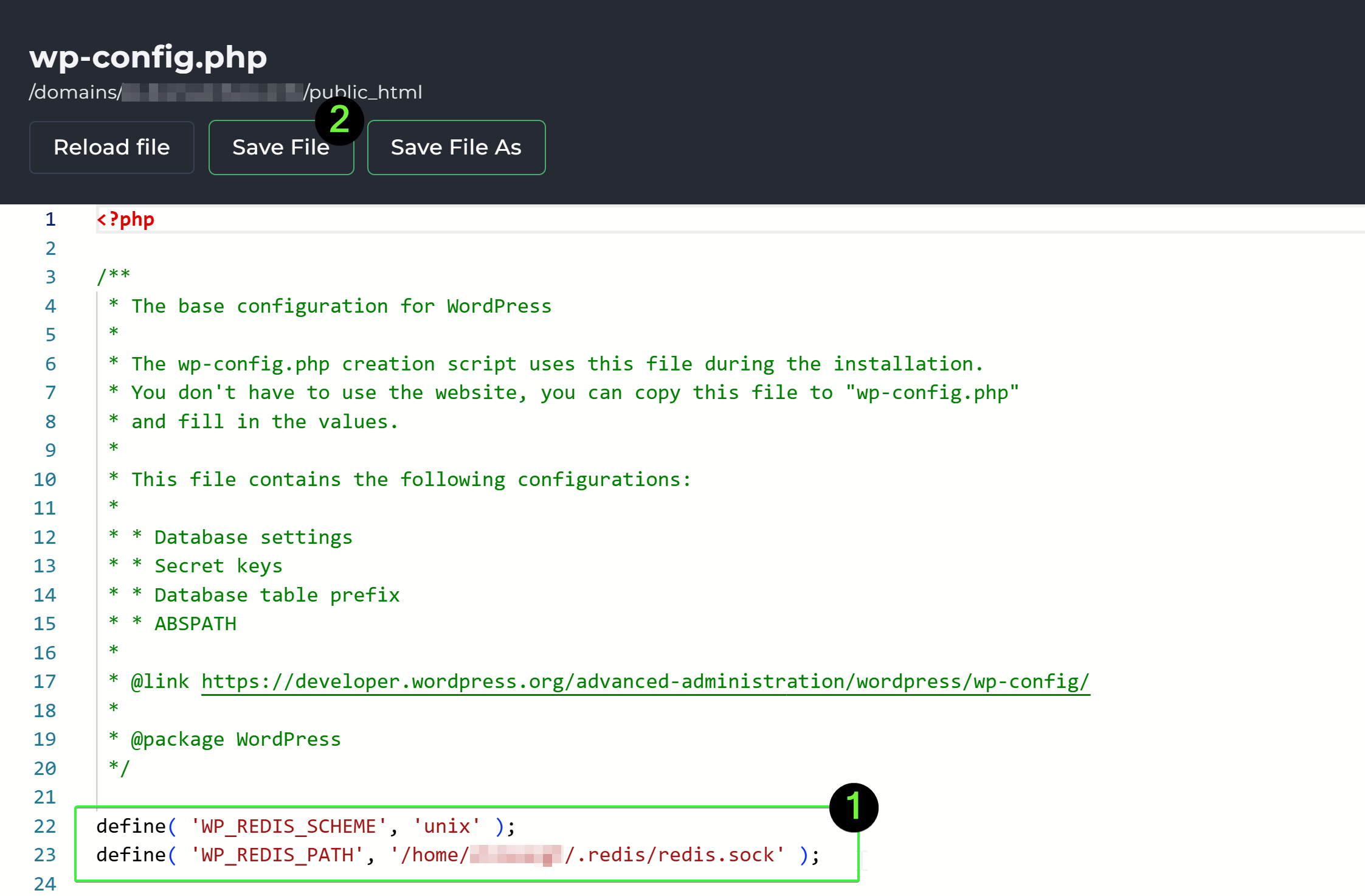 define( 'WP_REDIS_SCHEME', 'unix' ); define( 'WP_REDIS_PATH', '/path/to/redis.sock' ); // Replace with actual socket pathReplace /path/to/redis.sock with the socket path you copied earlier.